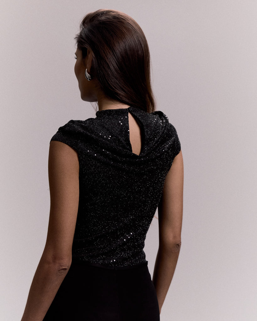 Black fitted bodysuit embellished with all-over crystals. Features a high neckline with elastic button fastening at the back, a front cut-out detail, and snap closure at the bottom. A bold, glamorous piece designed to shine.