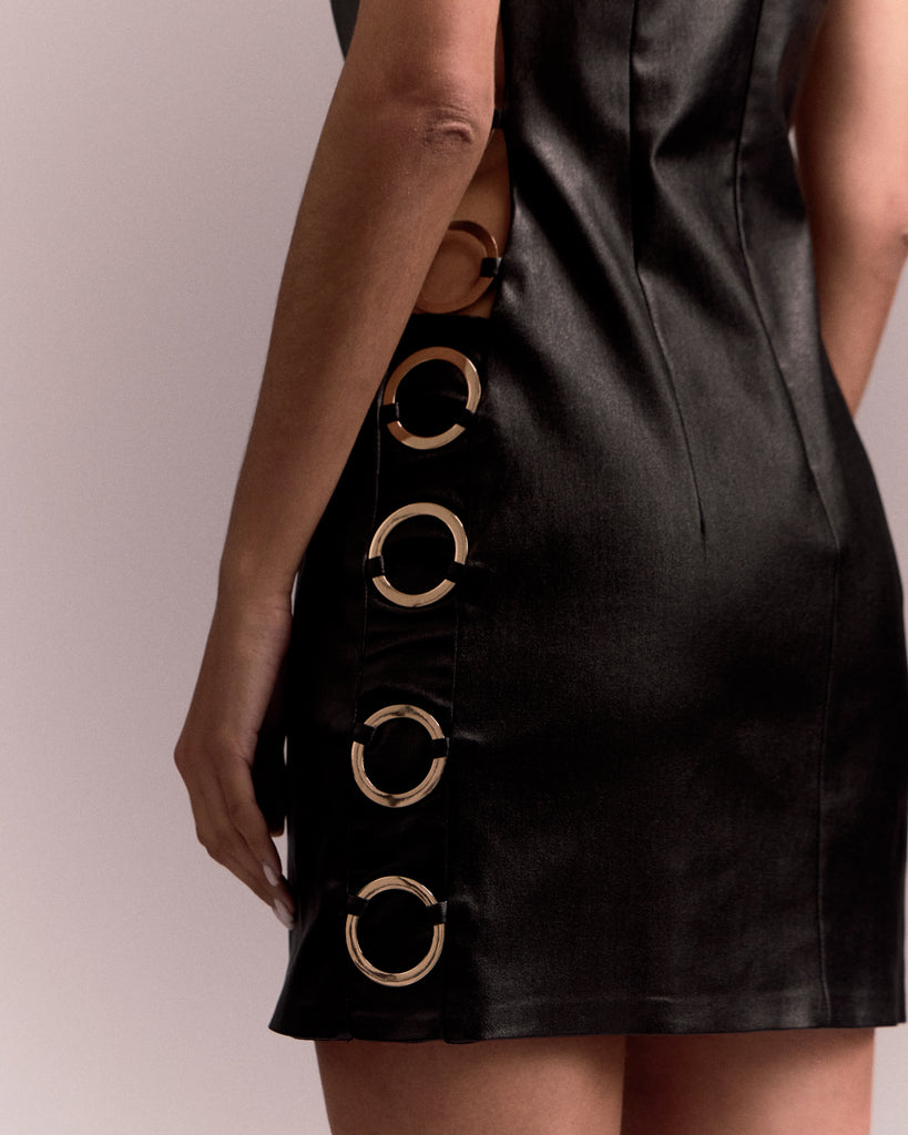 Mini dress in black iridescent vegan leather. Boat neckline, rounded V-back, and golden rings along the sides. Finished with a discreet back zip closure.