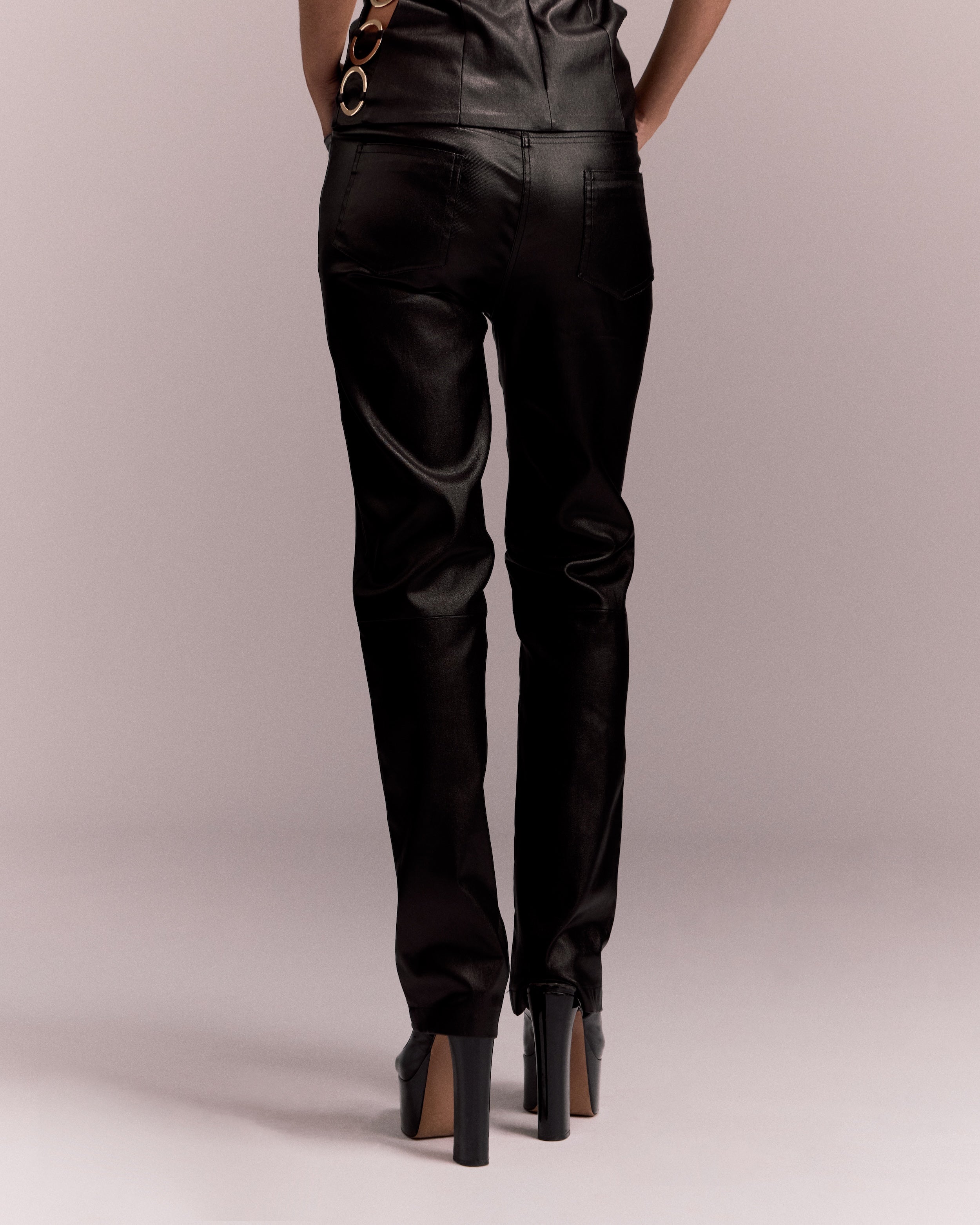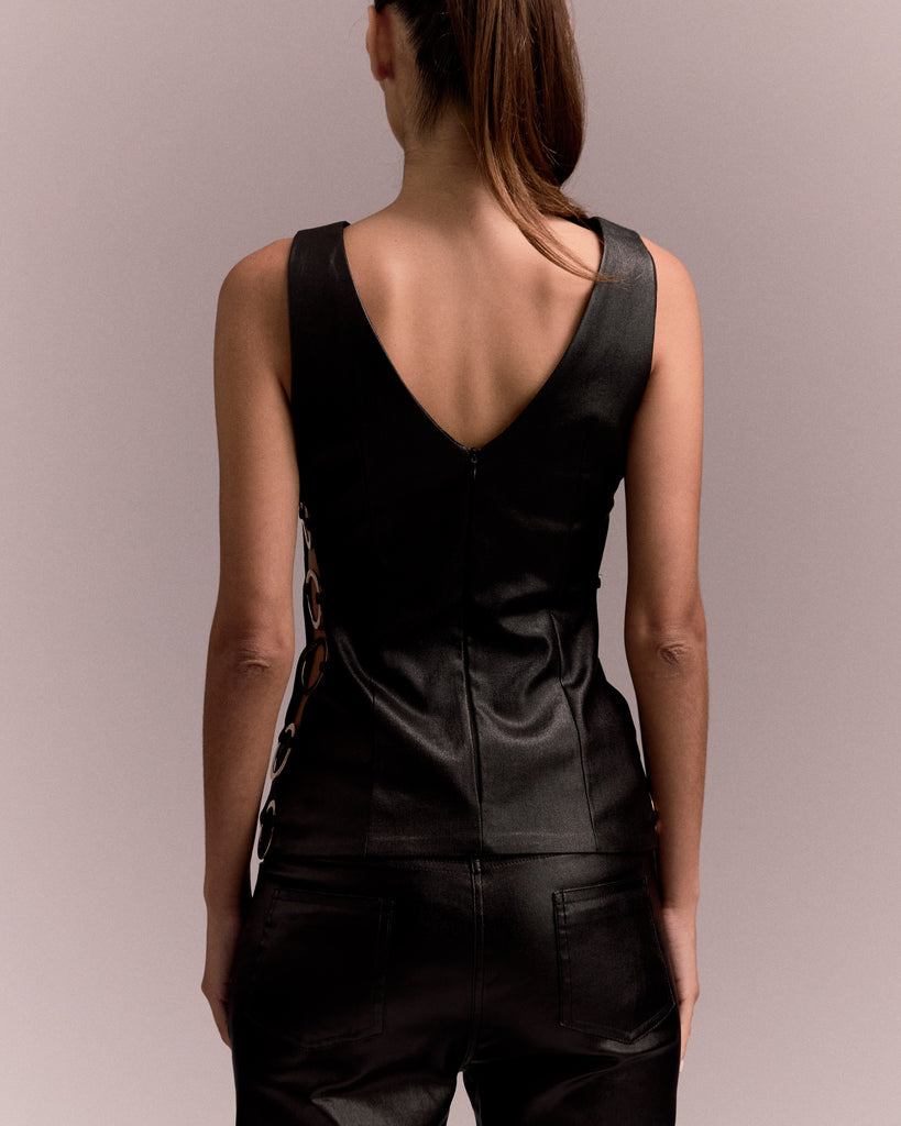 Fitted straight-cut top in black metallic iridescent vegan leather. Boat neckline, rounded V-shaped open back, and golden rings on the sides. Finished with a discreet back zip closure. Wear on its own or paired with the Mateo pants from the collection.
