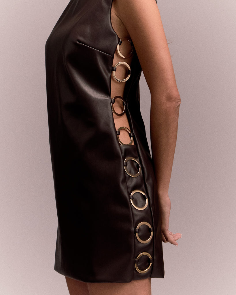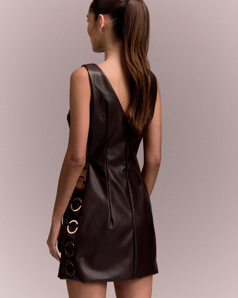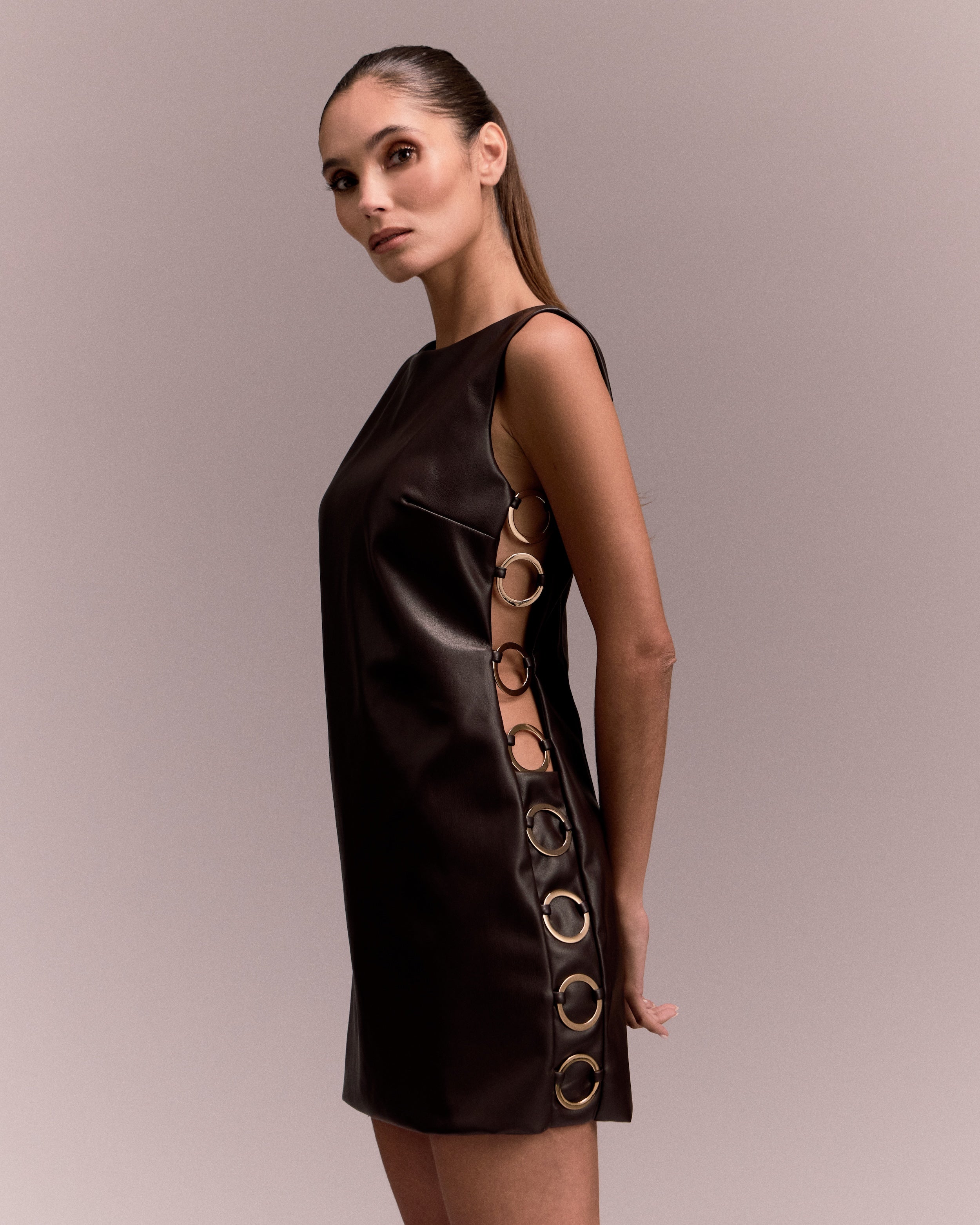Mini dress in brown vegan leather. Boat neckline, rounded V-back, and golden rings along the sides. Finished with a discreet back zip closure.