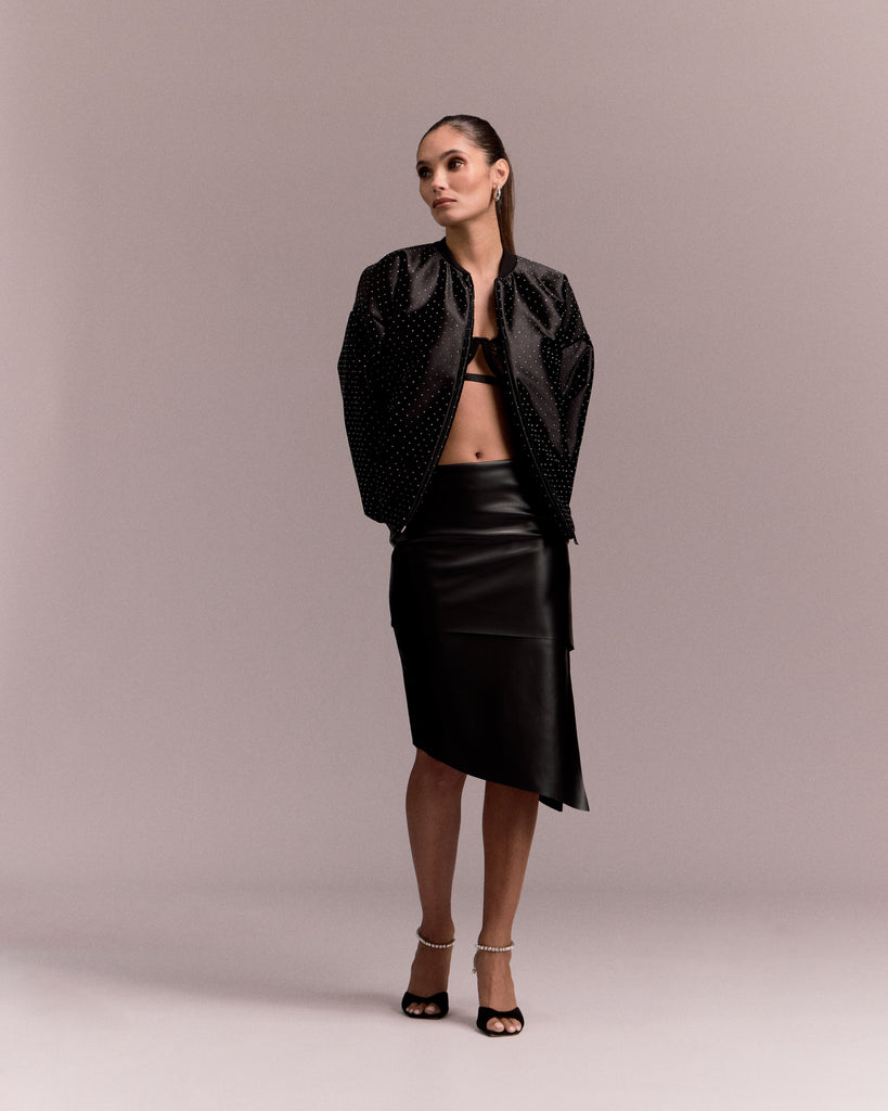Asymmetrical skirt in black vegan leather, featuring a side zip closure. Its modern cut and supple texture add a bold, contemporary edge to the silhouette.